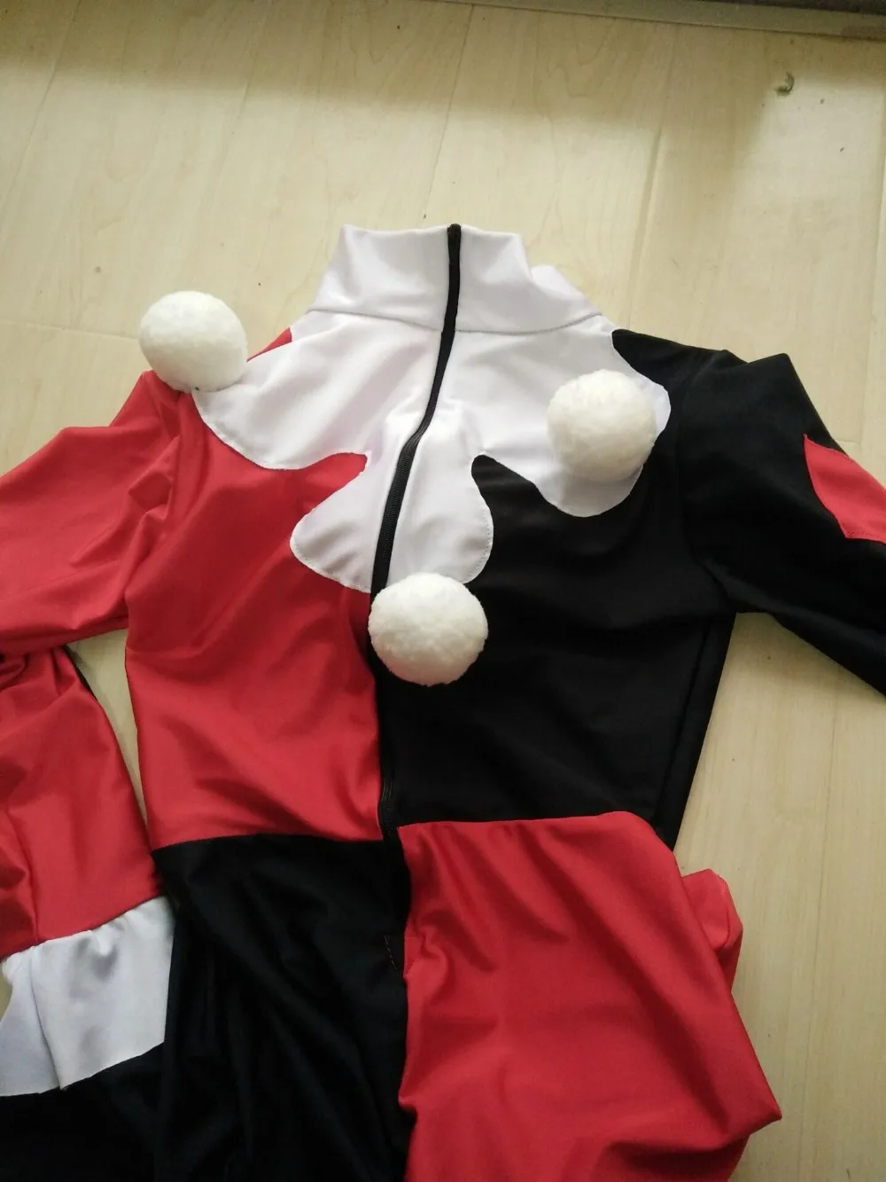 Classic red and black harlequin-style jumpsuit with diamond patterns